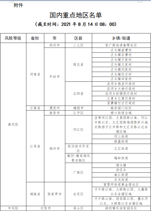 截至2021年8月14日08时,全国高风险地区27个,中风险地区 125个。