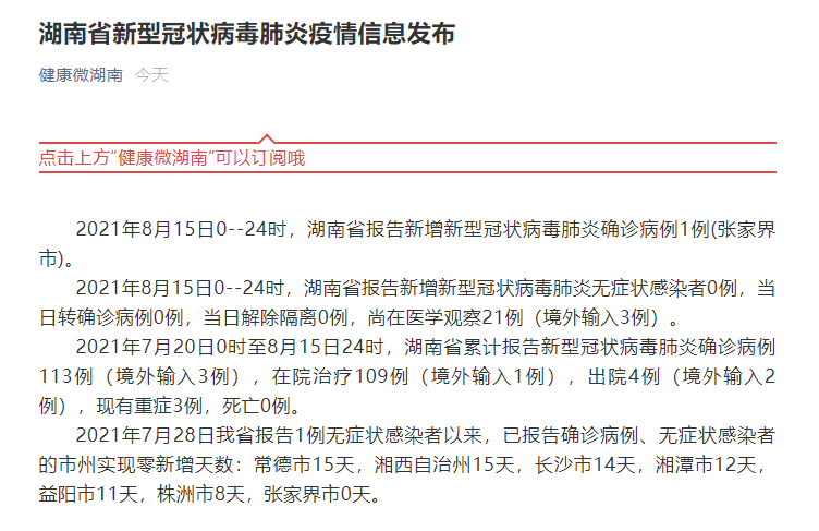2021年7月20日0时至8月15日24时,湖南省累计报告新型冠状病毒肺炎确诊病例113例(境外输入3例),在院治疗109例(境外输入1例),出院4例(境外输入2例),现有重症3例,死亡0例。