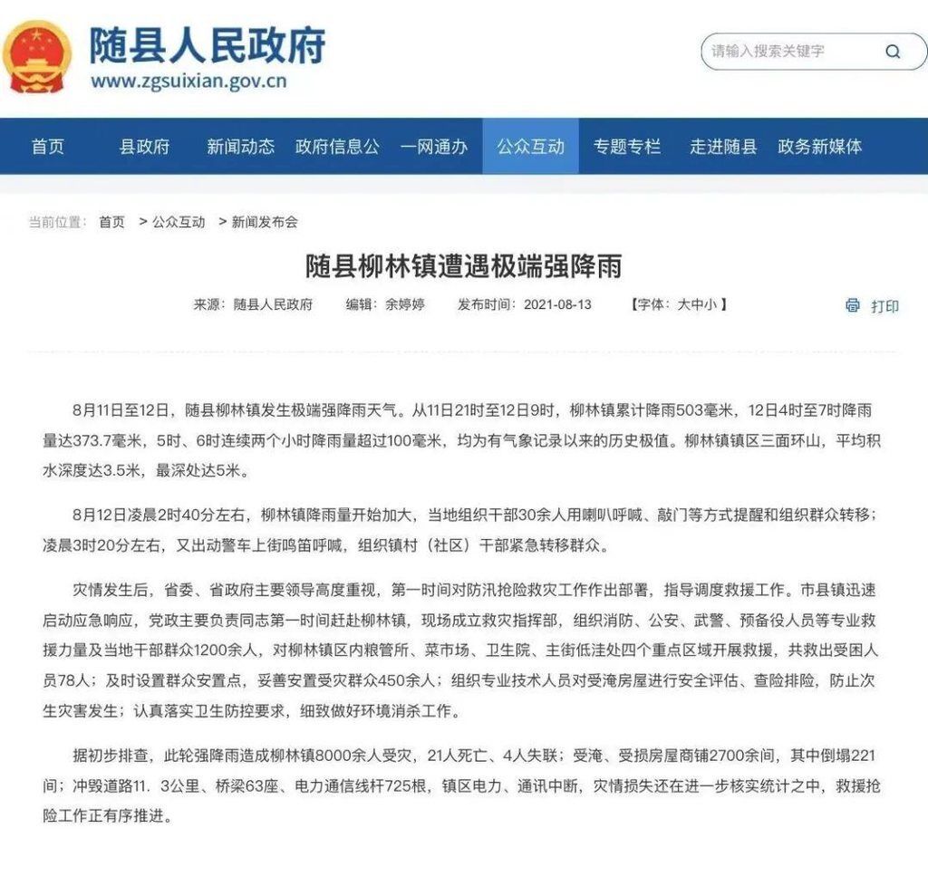 已致21人遇难、4人失联!湖北随县柳林镇遭遇极端强降雨!