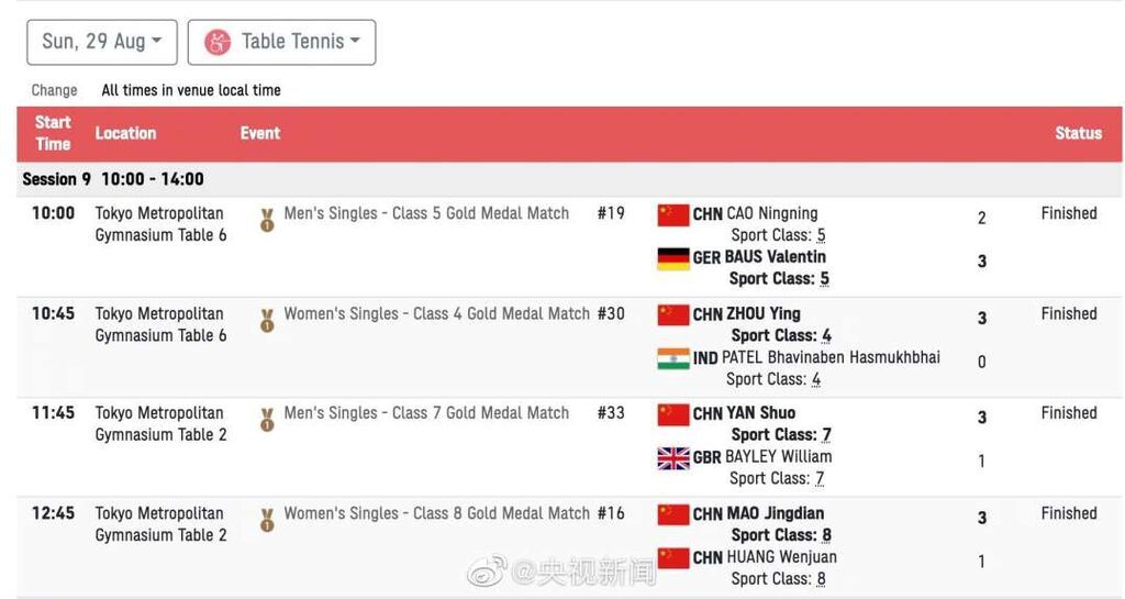 8月29日上午,东京残奥会乒乓球单打决赛中,周影获WS4级别金牌,闫硕获MS7级别金牌,茅经典获WS8级别金牌,黄文娟获WS8级别银牌,曹宁宁获MS5级别银牌!都是好样的!
