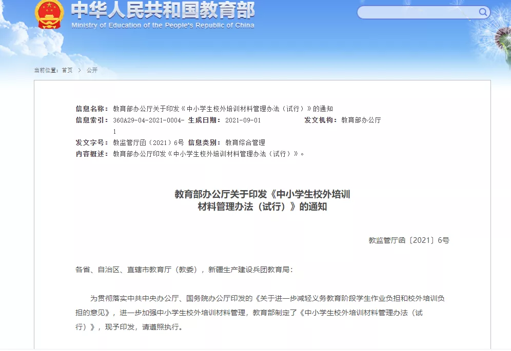 教育部网站9月6日消息,为深入贯彻中央《关于进一步减轻义务教育阶段学生作业负担和校外培训负担的意见》的决策部署,落实立德树人根本任务,全面加强校外培训监管,强化中小学生校外培训材料管理,教育部日前印发了《中小学生校外培训材料管理办法(试行)》(以下简称《管理办法》)。