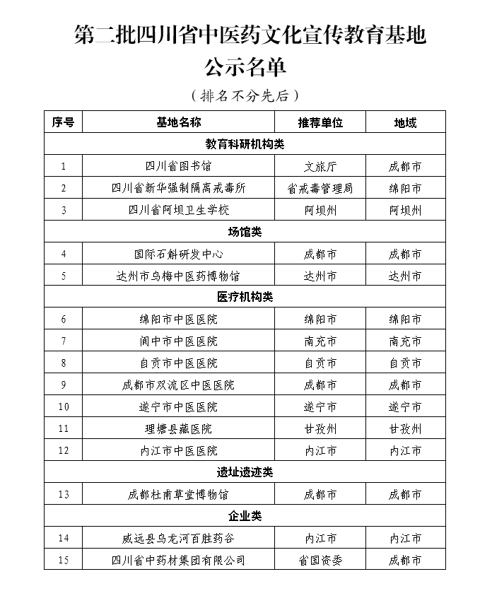 根据《中共四川省委宣传部 四川省中医药管理局关于开展第二批四川省中医药文化宣传教育基地申报与认定工作的通知》,经各地各部门推荐、专家评审、实地考察、会议推荐、社会公示等程序,确定了四川省图书馆等15家单位为第二批四川省中医药文化宣传教育基地。