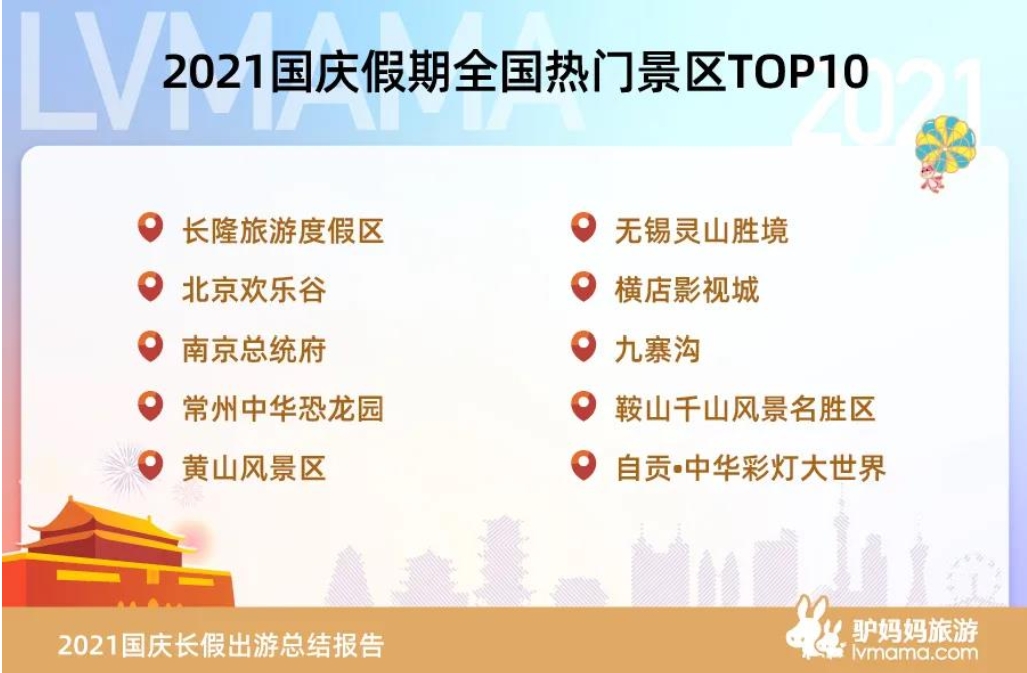 10月7日,驴妈妈发布的《2021年国庆出游总结报告》显示,国庆黄金周出游中,自贡·中华彩灯大世界、长隆旅游度假区、北京欢乐谷、九寨沟等景区名列全国前十。这已经是自贡·中华彩灯大世界继清明节、“五一”、端午节后,第四次获此殊荣。