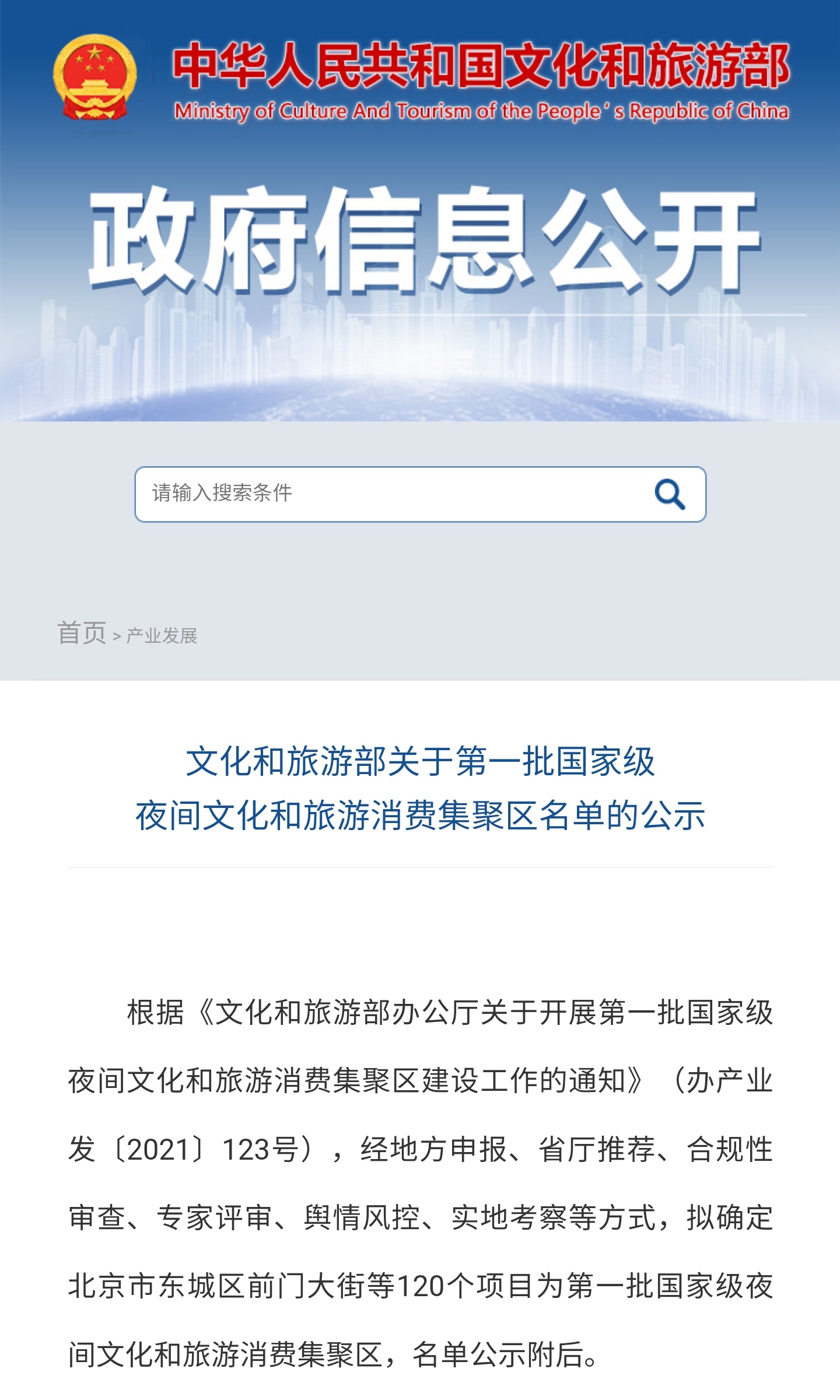 10月19日,记者从国家文化和旅游部官方网站获悉,根据《文化和旅游部办公厅关于开展第一批国家级夜间文化和旅游消费集聚区建设工作的通知》,经地方申报、省厅推荐、合规性审查、专家评审、舆情风控、实地考察等方式,拟确定北京市东城区前门大街等120个项目为第一批国家级夜间文化和旅游消费集聚区。其中,四川省自贡市中华彩灯大世界上榜公示名单。