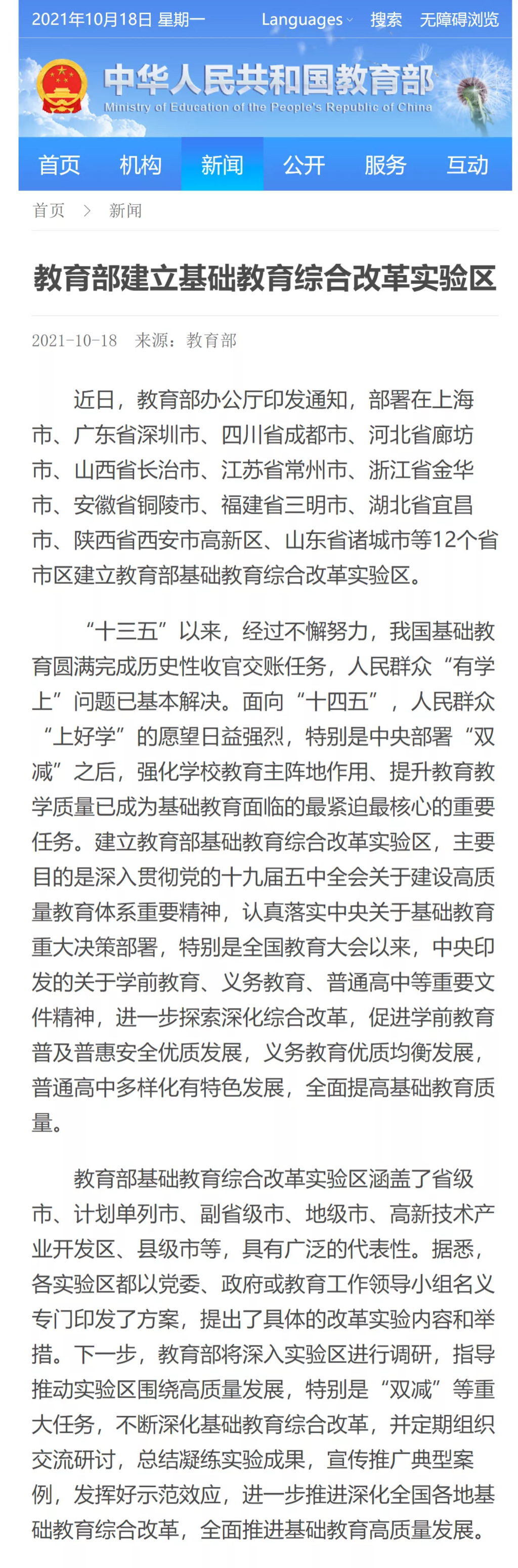 教育部就“建立基础教育综合改革实验区”进行权威发布