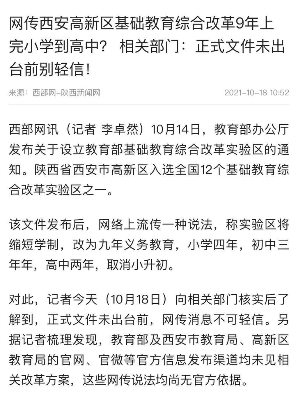 网传西安高新区基础教育综合改革9年上完小学到高中?相关部门:正式文件未出台前别轻信