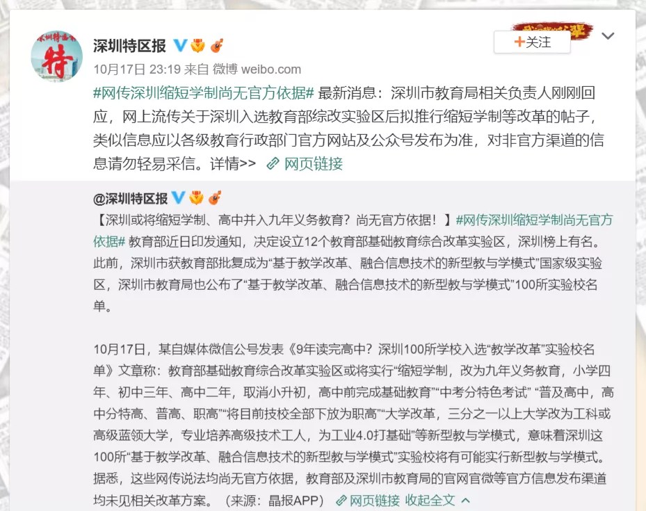 10月17日,某自媒体微信公号发表文章称:教育部基础教育综合改革实验区或将实行“缩短学制”。深圳市教育局相关负责人回应,网上流传关于深圳入选教育部综改实验区后拟推行缩短学制等改革的帖子,类似信息应以各级教育行政部门官方网站及公众号发布为准,对非官方渠道的信息请勿轻易采信。(深圳特区报微博)