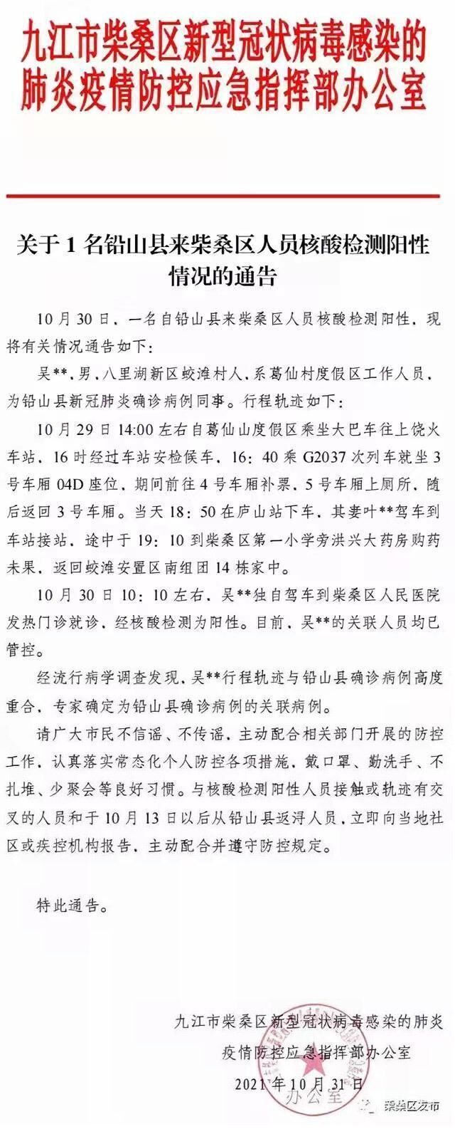 据江西省卫健委消息,10月30日,一名自铅山县返回九江市柴桑区人员核酸检测阳性,系铅山县确诊病例同事。具体情况如下: