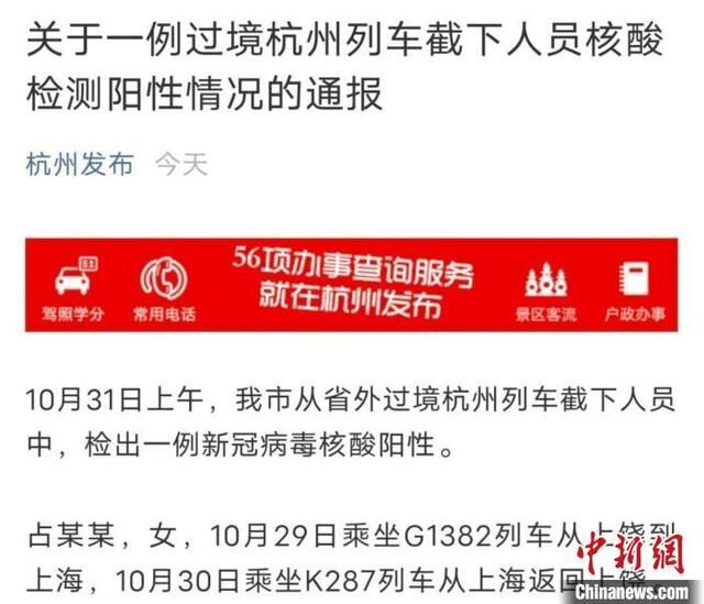 她表示,目前杭州全域为低风险地区,该病例从发现到隔离严格落实全过程闭环管理,请市民不必恐慌。与此同时,乘坐10月29日G1382(上饶—上海)列车、30日K287(上海—南昌)列车的人员以及14天内从江西省上饶市铅山县来杭返杭人员,需主动向所在社区、单位、酒店报备相关情况,并配合做好健康管理措施。(完)