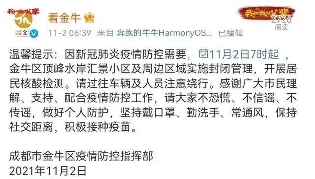 提示中写道:因新冠肺炎疫情防控需要,11月2日7时起,金牛区顶峰水岸汇景小区及周边区域实施封闭管理,开展居民核酸检测。请过往车辆及人员注意绕行。