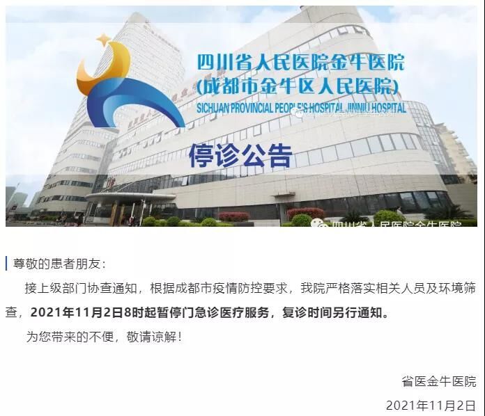 2日上午8时,四川省人民医院金牛医院通过官方微信公众号发布停诊通知:从11月2日8时起暂停门急诊医疗服务,复诊时间另行通知。