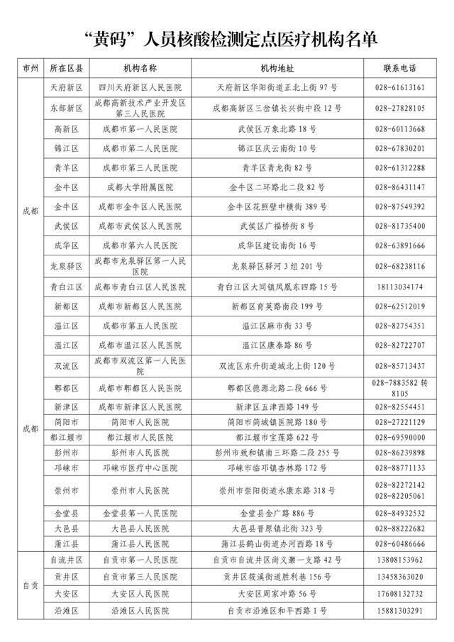 “黄码”人员核酸检测定点医疗机构名单可在四川省卫生健康委官方网站http://wsjkw.sc.gov.cn查询,也可咨询当地卫生健康行政部门。
