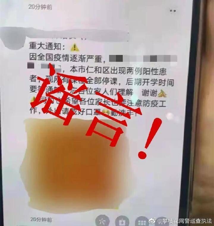 2021年11月8日,攀枝花市两名男子蒋某某、程某因散布谣言,谎报疫情扰乱公共秩序,被仁和警方依法行政拘留。