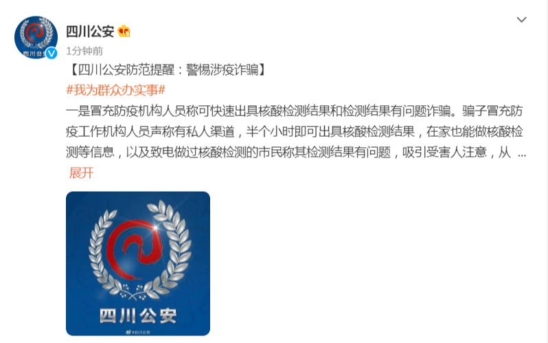 四川公安提醒,诈骗手法层出不穷,广大人民群众一定要提高警惕,不要轻信陌生来电,不要点击可疑链接,不要轻易透露个人信息、银行卡信息、验证码等,查询个人健康出行信息请到正规网站、APP上办理。