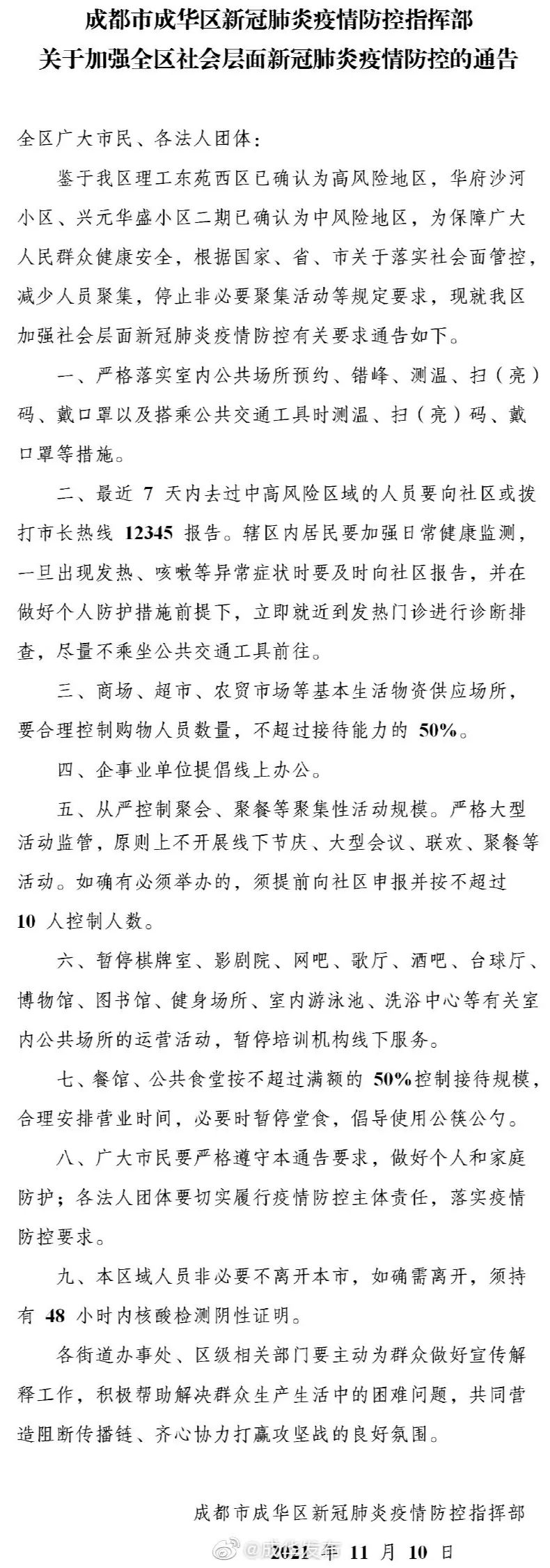 11月10日,成都市成华区新冠肺炎疫情防控指挥部发布关于加强全区社会层面新冠肺炎疫情防控的通告。全文如下: