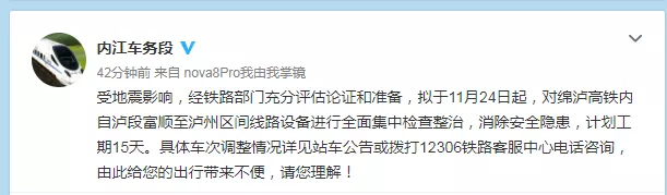 据内江车务段官方微博消息,受地震影响,经铁路部门充分评估论证和准备,拟于11月24日起,对绵泸高铁内自泸段富顺至泸州区间线路设备进行全面集中检查整治,消除安全隐患,计划工期15天。具体车次调整情况详见站车公告或拨打12306铁路客服中心电话咨询,由此给您的出行带来不便,请您理解!