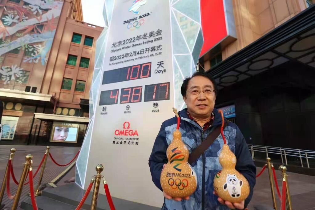 在北京冬奥会开幕倒计时100天之际,龚虎彪手捧画有北京冬奥会会徽和吉祥物的葫芦,与冬奥会倒计时牌合影。(受访者提供)