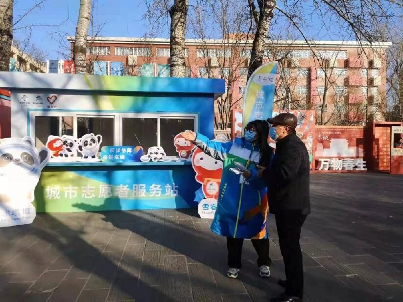 1月8日,北京市东城区地坛八区文化广场,冬奥城市志愿者服务站为市民讲解体验活动设施。(受访者提供)