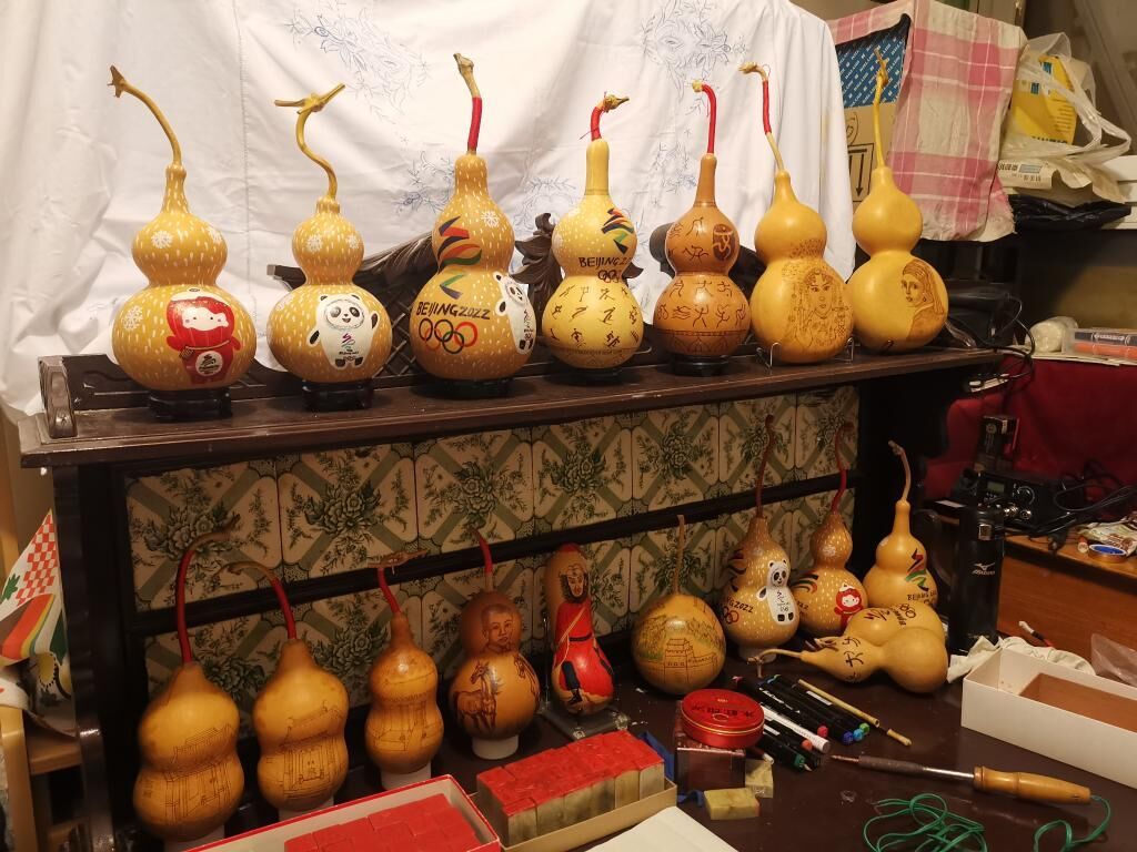 “胡同艺术家”龚虎彪用葫芦烙画方式创作的一系列冬奥主题作品。新华社记者赵琬微摄