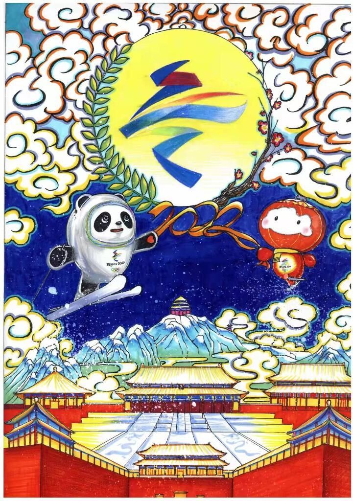 北京市第六十五中学学生刘禹泽用两年时间创作了版画《激情冰雪》。作品中,挥舞着丝带的“冰墩墩”“雪容融”在故宫和景山上空翩翩起舞,在雪色中格外醒目。将传统技艺与冬奥元素相结合,将奥运文化与中华传统文化相结合,胡同人家、中小学生纷纷借艺术创作表达对北京冬奥会的祝福。