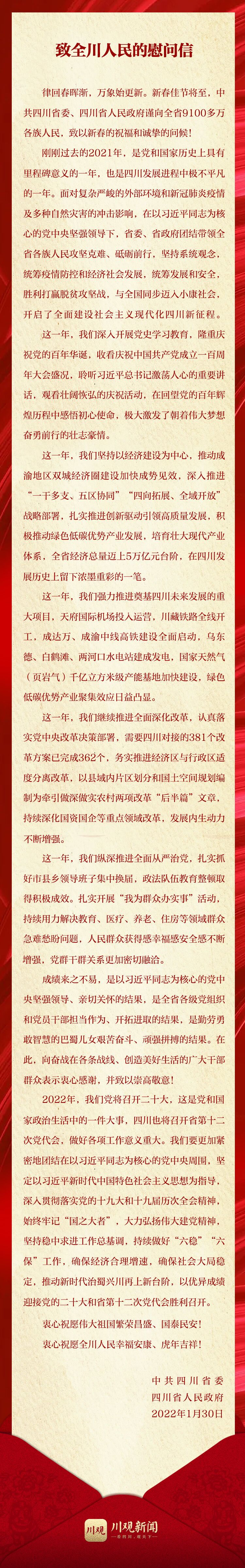 新春佳节将至,中共四川省委、四川省人民政府发出慰问信,向全省9100多万各族人民,致以新春的祝福和诚挚的问候!衷心祝愿伟大祖国繁荣昌盛、国泰民安!衷心祝愿全川人民幸福安康、虎年吉祥!