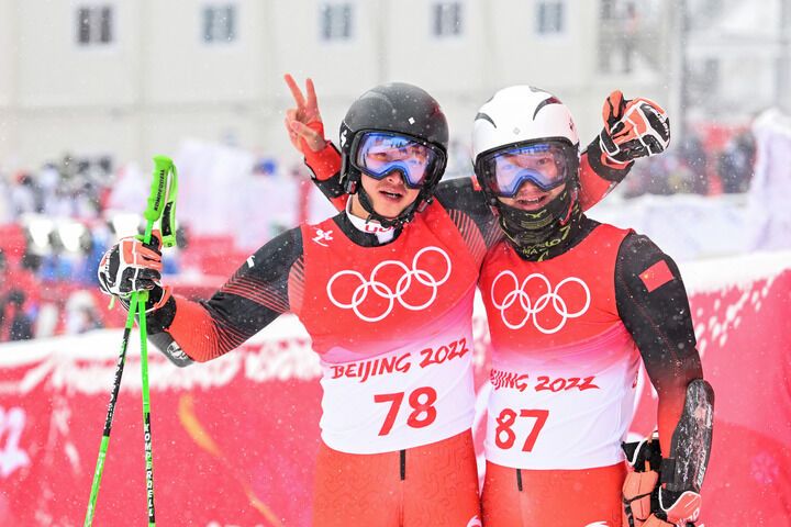 中国运动员张洋铭、徐铭甫13日在高山滑雪男子大回转中冒雪完赛。赛后张洋铭直言,虽然自己和世界顶尖选手还有不小差距,但他享受和各国(地区)运动员在雪中一同拼搏的感觉。