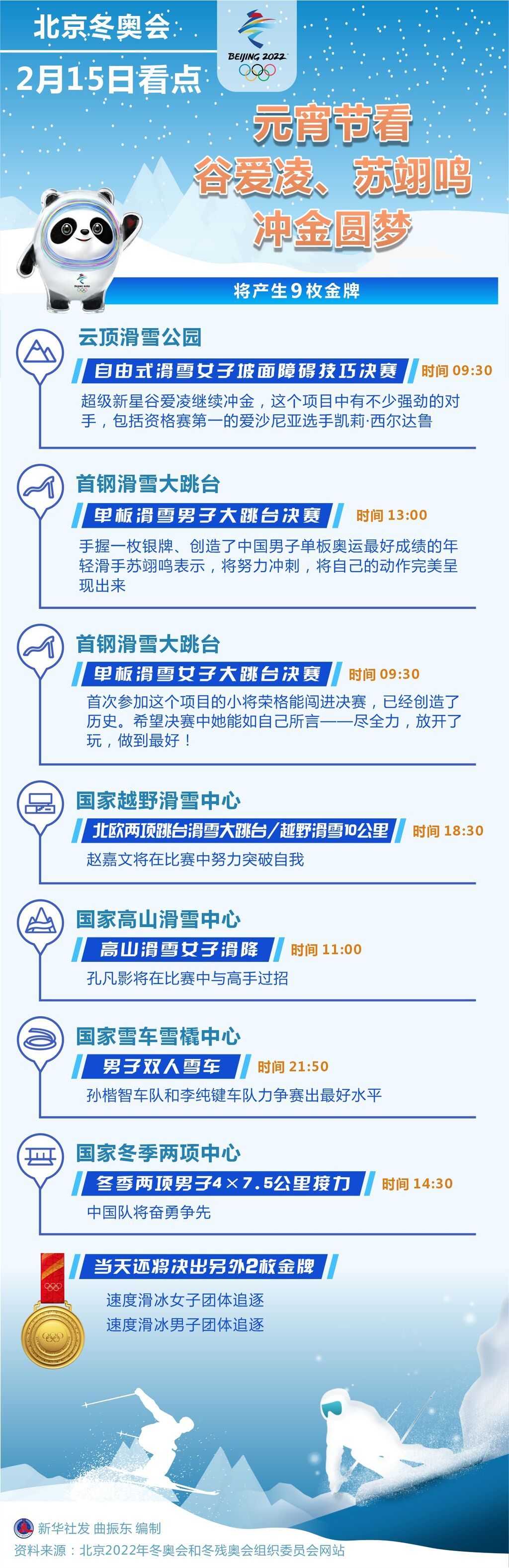 15日是中国传统的元宵佳节,运动健儿将继续在北京冬奥会上为梦想而战。当天将产生9枚金牌,中国选手将参与多个项目角逐,其中包括超级新星谷爱凌和苏翊鸣。