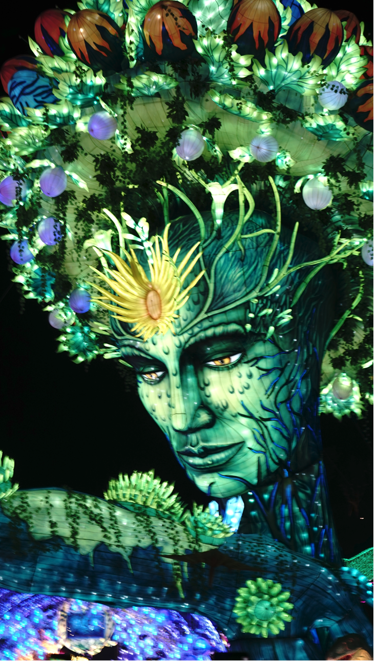 去年回自贡,我也去看了廖信忠看的那场彩灯展,去年最火的主题是“侏罗纪公园”,最震撼的是刷爆全网的“生命之树”。跟着人群一点点靠近,“树妖”的眼睛缓慢开阖,表情悲悯,难辨雌雄。走到正下方跟其对视,被一种神秘感笼罩,感觉自己很渺小。不过,对“生命之树”只能匆匆一瞥,后面有排着长队的人群等待一次“回眸”。
