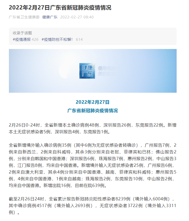 2月26日0-24时,全省新增本土确诊病例48例,深圳报告26例,东莞报告22例。新增本土无症状感染者5例,深圳报告4例,东莞报告1例。