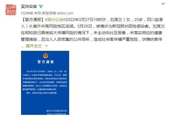 [警方通报]#吴兴公安#2022年3月27日18时许,刘某兰(女,25岁,四川盐亭人)从省外中高风险地区返湖。3月28日,被确诊为新冠肺炎阳性感染者。刘某兰在明知自己具有较大传播风险的情况下,未主动向社区报备,未落实相应的健康管理措施,且出入人员密集的公共场所,造成社会面传播严重危险,涉嫌妨害传染病防治罪。目前,刘某兰已被公安机关立案侦查。