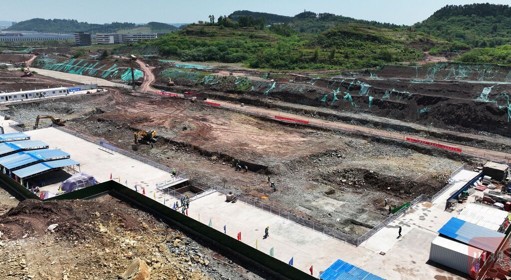 “突突突……”当天,川观新闻记者走进临港站站房建设现场,传来震耳欲聋的机械作业声,循声望去,一台破碎机正在施工,将破碎锤用力钻向地下。20余亩场地上,建设全面拉开——挖掘机、破碎机、运渣车齐齐开动,钢筋加工车间内工人有条不紊地进行切割作业,还有测量人员在即将进行基坑施工的地面划出作业区域……