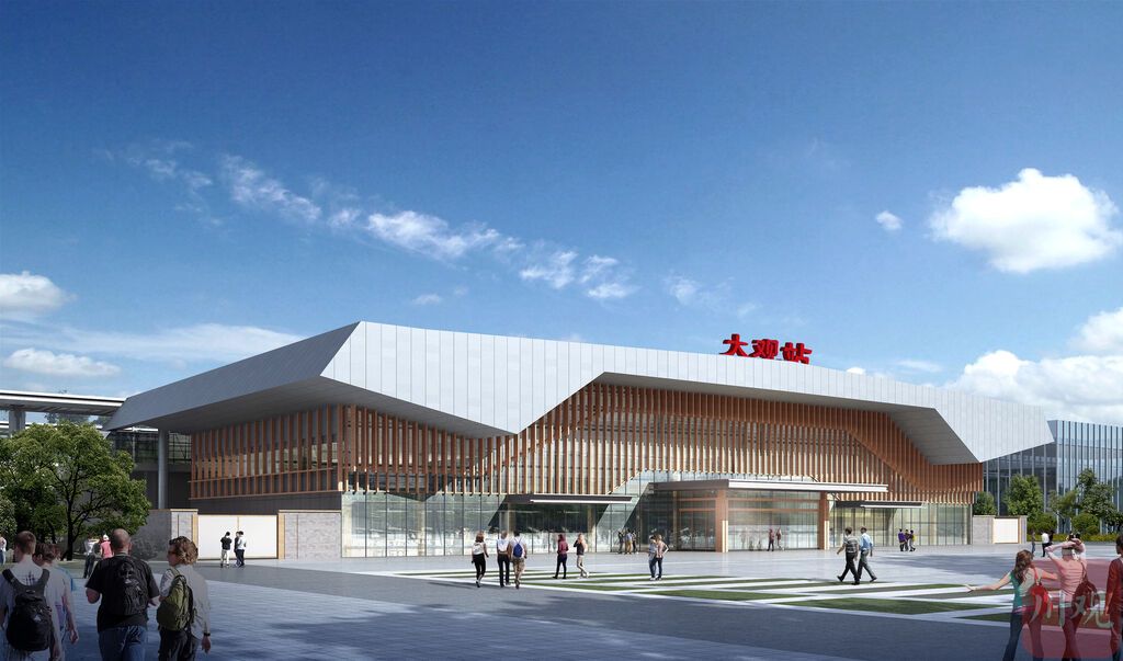 临港站的车站造型也别具特色。站房从正面看去像雄鹰振翅欲飞,立面的起伏好似层叠的山峦,立面上的三个门斗象征着在山中奔腾又在临港交汇的三江,时尚前卫又体现了地方特征。