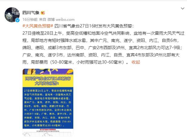 四川省气象台27日16时发布大风黄色预警: