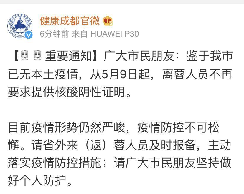 5月8日晚,健康成都官微发布最新通知:鉴于成都市已无本土疫情,从5月9日起,离蓉人员不再要求提供核酸阴性证明。