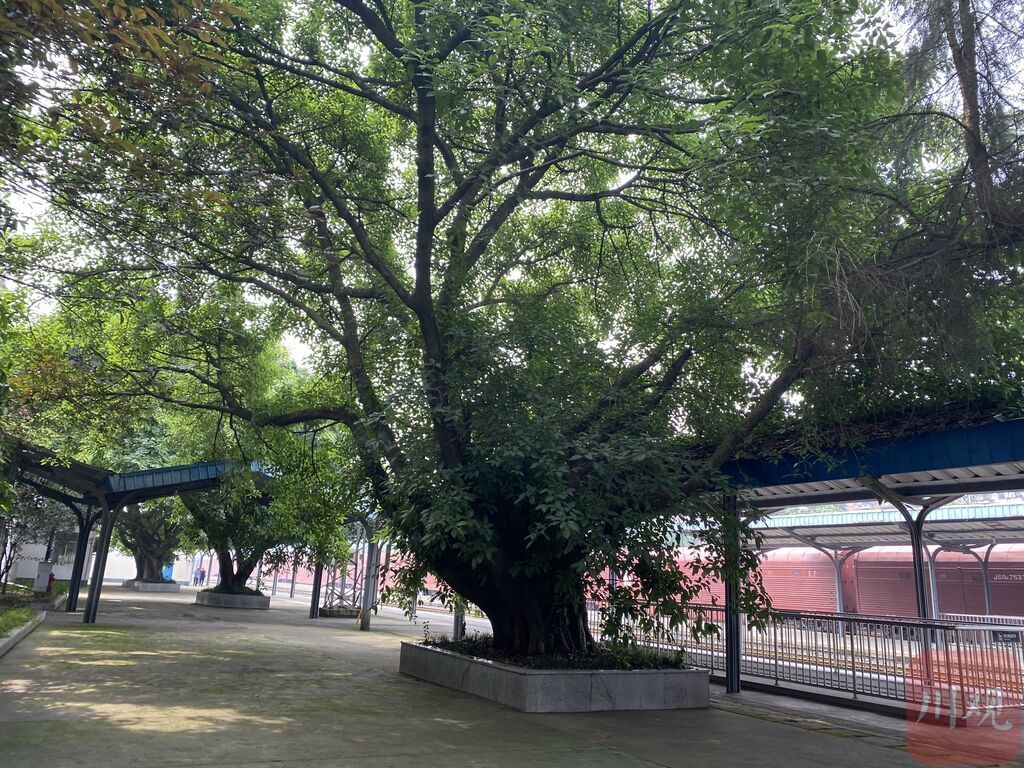 重庆永川站,站台上依次排列的大榕树十分显眼。这些榕树树干粗壮,树根深扎泥土之中。