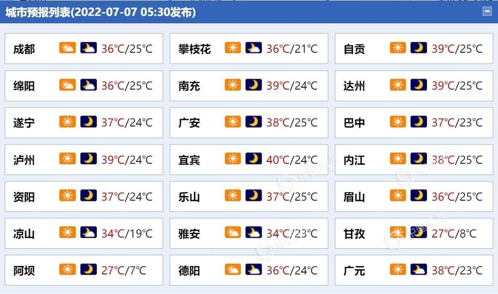 热到破纪录!昨天(7月6日),四川简阳、青川等多地最高气温超过40℃,打破当地气温极值纪录。未来三天,四川盆地仍以晴热天气为主,成都等多地高温持续,需注意防暑。