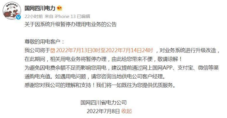 7月8日,国网四川省电力公司发布公告,公司将于7月13日0时至7月14日24时对业务系统进行升级改造,在此期间,相关用电业务将暂停办理。