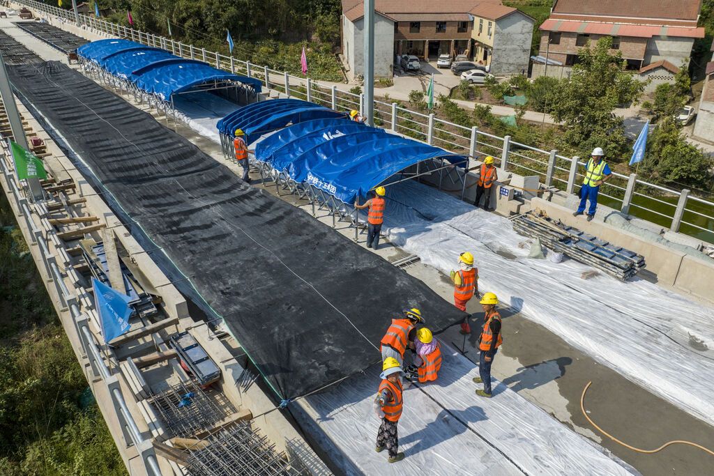 “成自宜高铁时速350公里,无砟轨道的平整度决定着列车行驶的平稳性和舒适性。近期四川地区的持续高温给我们施工带来不小考验。”邵引明说,工地现场实测最高温47摄氏度,而混凝土须低于30摄氏度浇筑才能确保质量,为此,项目部将一线施工作业时间进行了调整,避开10:00至16:30的高温时段,选在温度偏低的早上和夜间施工,混凝土浇筑则在深夜温度最低的时候进行;同时,通过增设遮阳雨棚和自动喷淋养护系统等措施,确保无砟轨道施工质量。