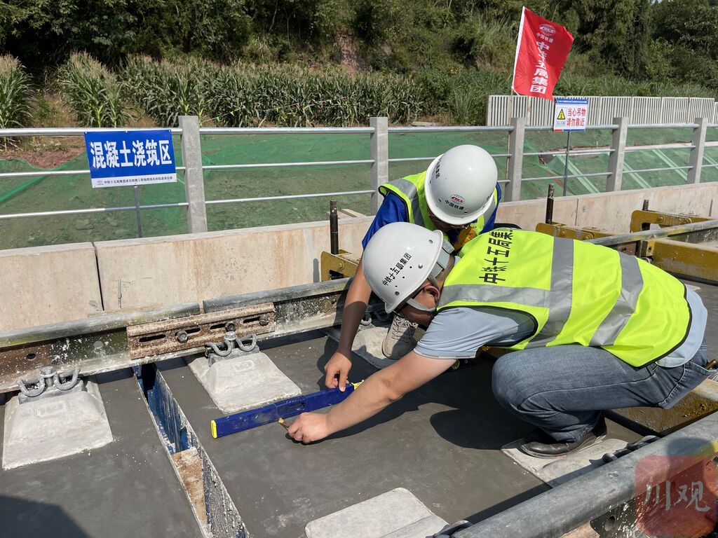 早上9时许,成自宜高铁前丰村双线特大桥施工现场,气温已经高达31℃。桥上,从成都往自贡方向,右侧已经完成浇筑的无砟轨道底座板上,一块道床板已经成型——还未浇筑混凝土的钢筋模型内,几名施工人员正在对钢筋进行精调;已经浇筑了混凝土的部分,扣件、轨枕也已安装到位,两名技术人员拿着工程尺在道床面进行测量:“这道面看起来是平的,实则要有一定弧度,中间高、两边低,才能不积水。”