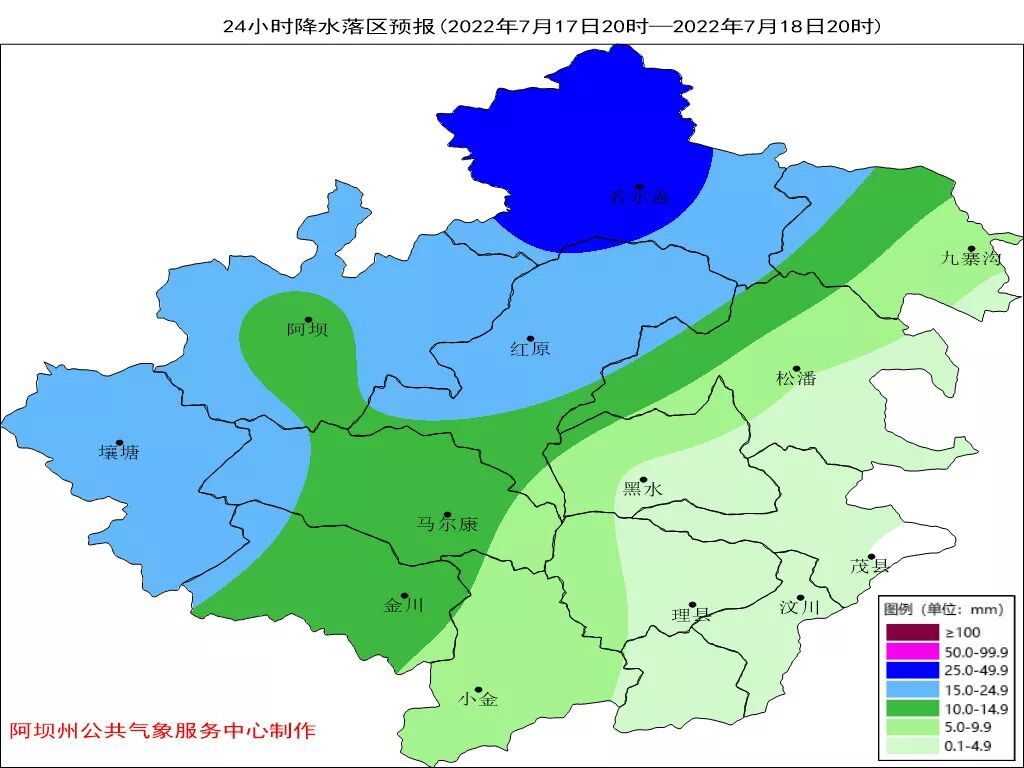 阿坝州气象台预计,7月18日中午到晚上,阿坝自西向东有一次明显降水天气过程。全州多云转阴天有中雨,北部(阿坝县、壤塘县、红原县、若尔盖县、九寨沟县)、中部(马尔康市)、西南部(金川县、小金县)部分乡镇有大雨到暴雨,全州最高气温将下降2~6摄氏度。过程期间将伴有雷暴大风、短时强降水、冰雹等强对流天气,请各相关部门注意防范强降雨可能引发的山洪、泥石流等次生灾害的发生。