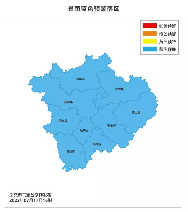 南充市气象台7月17日16时发布暴雨蓝色预警: