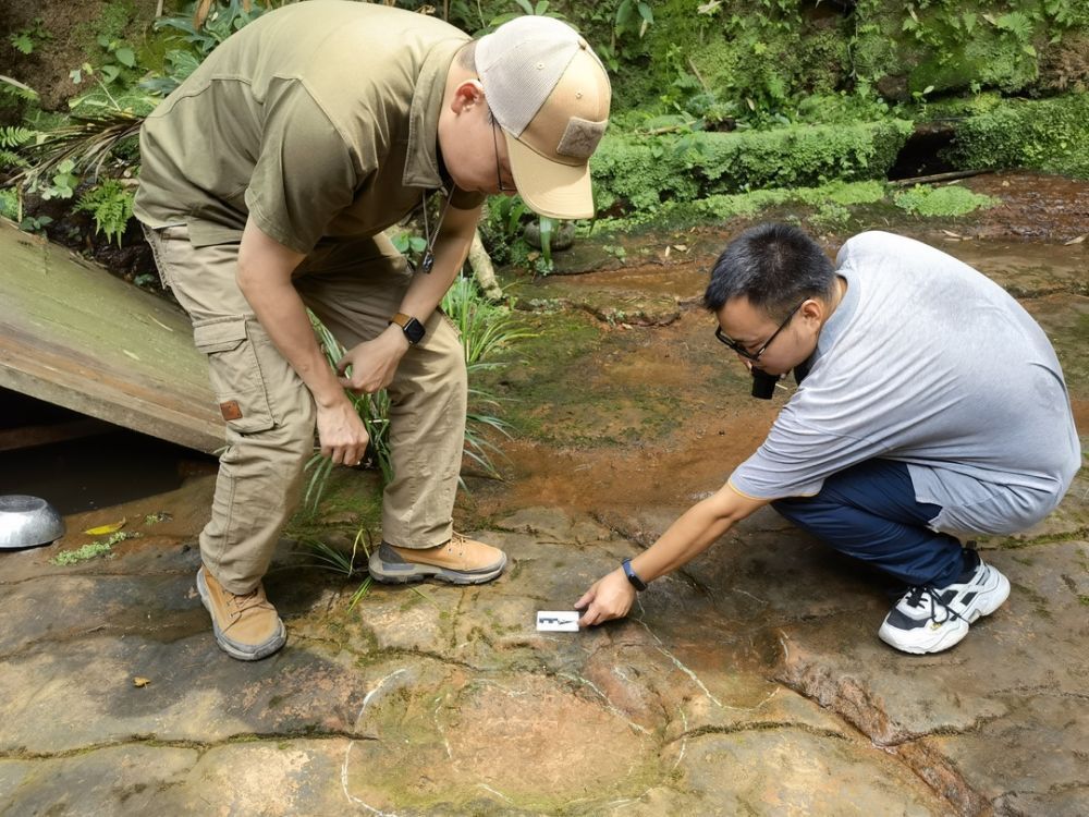 在足迹点,邢立达与彭光照等组成的专家团队对足迹点进行了仔细研究测量,并对足迹进行了无人机拍摄以及3D扫描。经研究认定,这批足迹为白垩纪早期夹关组的雷龙足迹,十余个足迹组成了两道行迹。