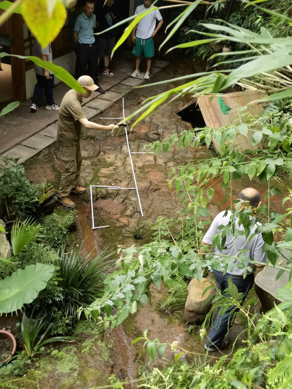 记者在现场看到,这是一个幽静的小院坝,不注意的话,只发现地面有几个不起眼的水坑,其中一处莲花开得正艳。餐厅负责人朱敏女士安排人将坑中的积水排干,一行足迹立刻显现出来。