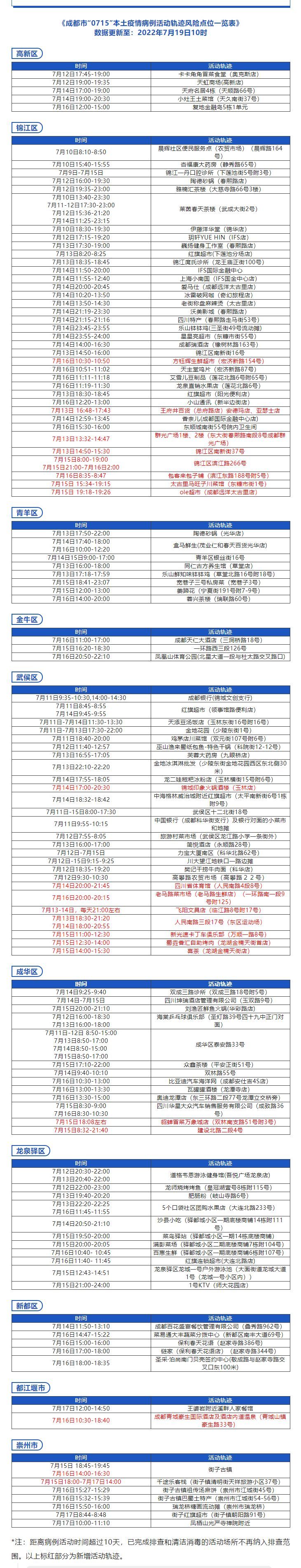 为方便市民排查风险轨迹,现将成都市本轮本土疫情病例活动轨迹整理如下,请市民朋友们对照自查。如与以下活动轨迹有重叠,立即向社区和单位(或居住的酒店)报备,三天内接受两次核酸检测(间隔24小时),期间做好个人防护,不聚会、不聚餐。如有疑问,请拨打12345咨询。