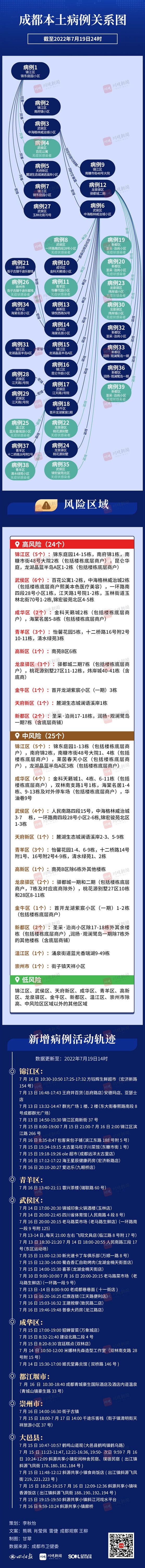 7月20日上午,成都市卫健委官方微信发布消息:7月19日0-24时,成都市新增本土确诊病例6例(其中4例为既往通报的无症状感染者转确诊),新增本土无症状感染者3例,均在隔离管控人员中发现。截至7月19日24时,成都市本轮疫情累计报告本土确诊病例26例,本土无症状感染者13例。
