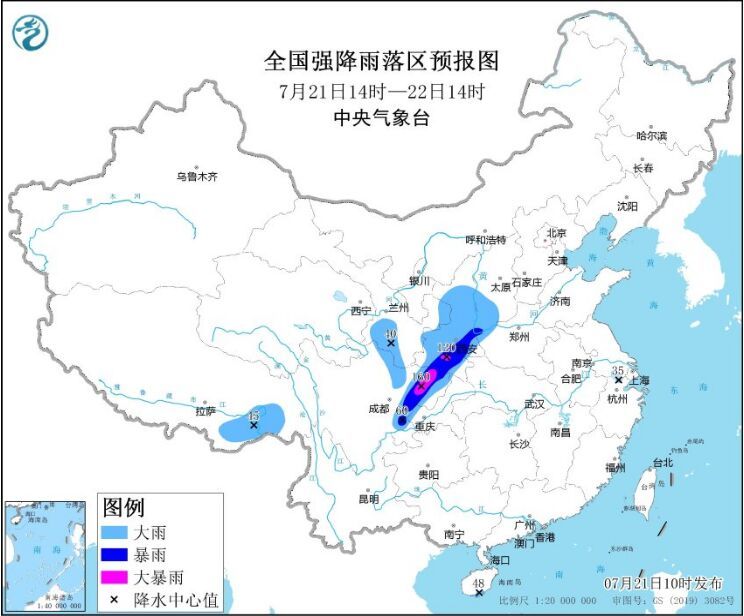 预计,7月21日14时至22日14时,甘肃南部、陕西、山西西南部、四川东部、重庆西部以及西藏东南部等地部分地区有大到暴雨,其中,陕西南部、四川东北部等地局地有大暴雨(100~160毫米)。上述部分地区伴有短时强降水(最大小时降雨量20~50毫米,局地可超过60毫米),局地有雷暴大风等强对流天气。