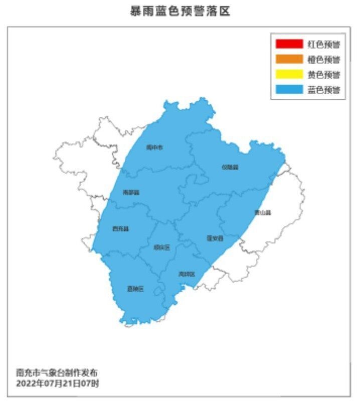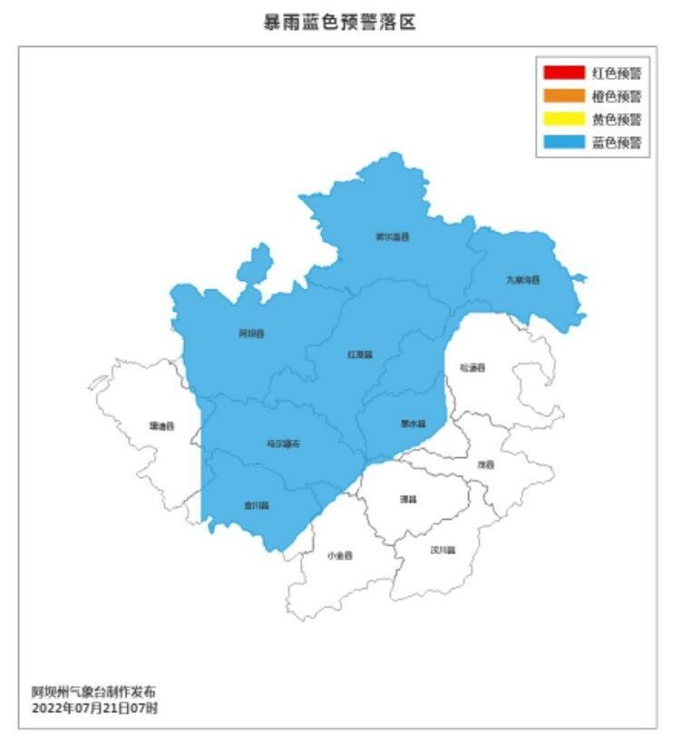 截至记者发稿,阿坝州、南充市气象台已先后发布暴雨蓝色预警——