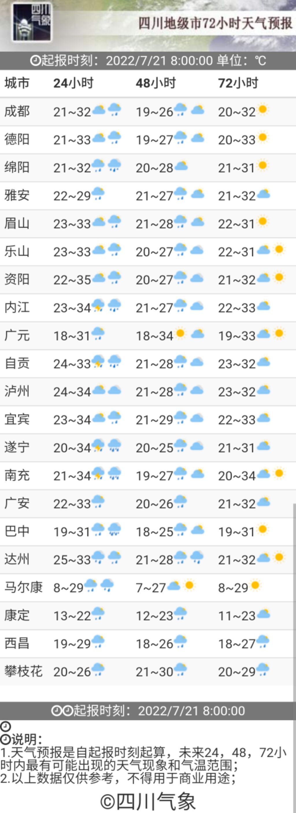 预计今天(7月21日)晚上,四川盆地各市阴天有阵雨和雷雨,雷雨时有短时阵性大风,部分地方有中雨,其中巴中、南充、遂宁、资阳4市及内江、自贡、绵阳、广元4市东部的部分地方有大雨大暴雨,局部大暴雨;甘孜州西北部多云,川西高原其余地方阴天间多云有阵雨或雷雨,部分地方有中雨,局部大雨;攀西地区阴天间多云,有阵雨或雷雨。