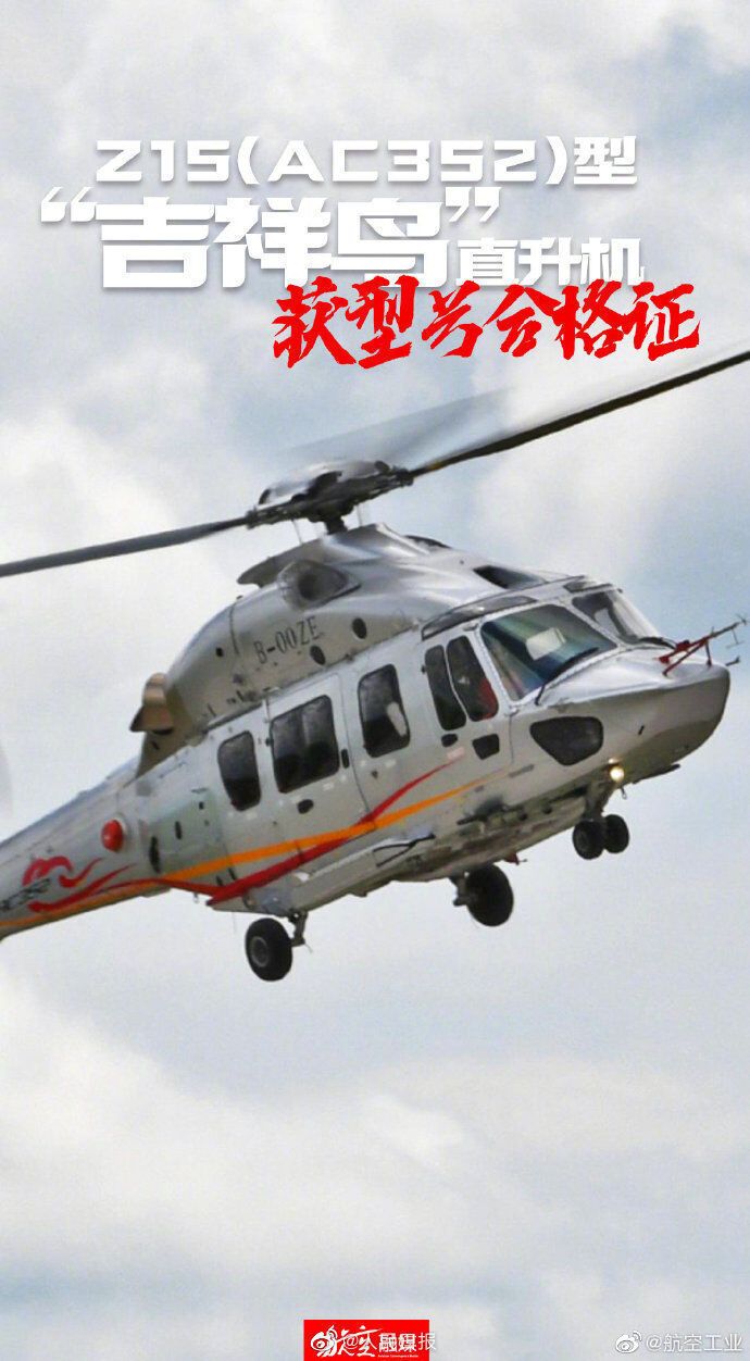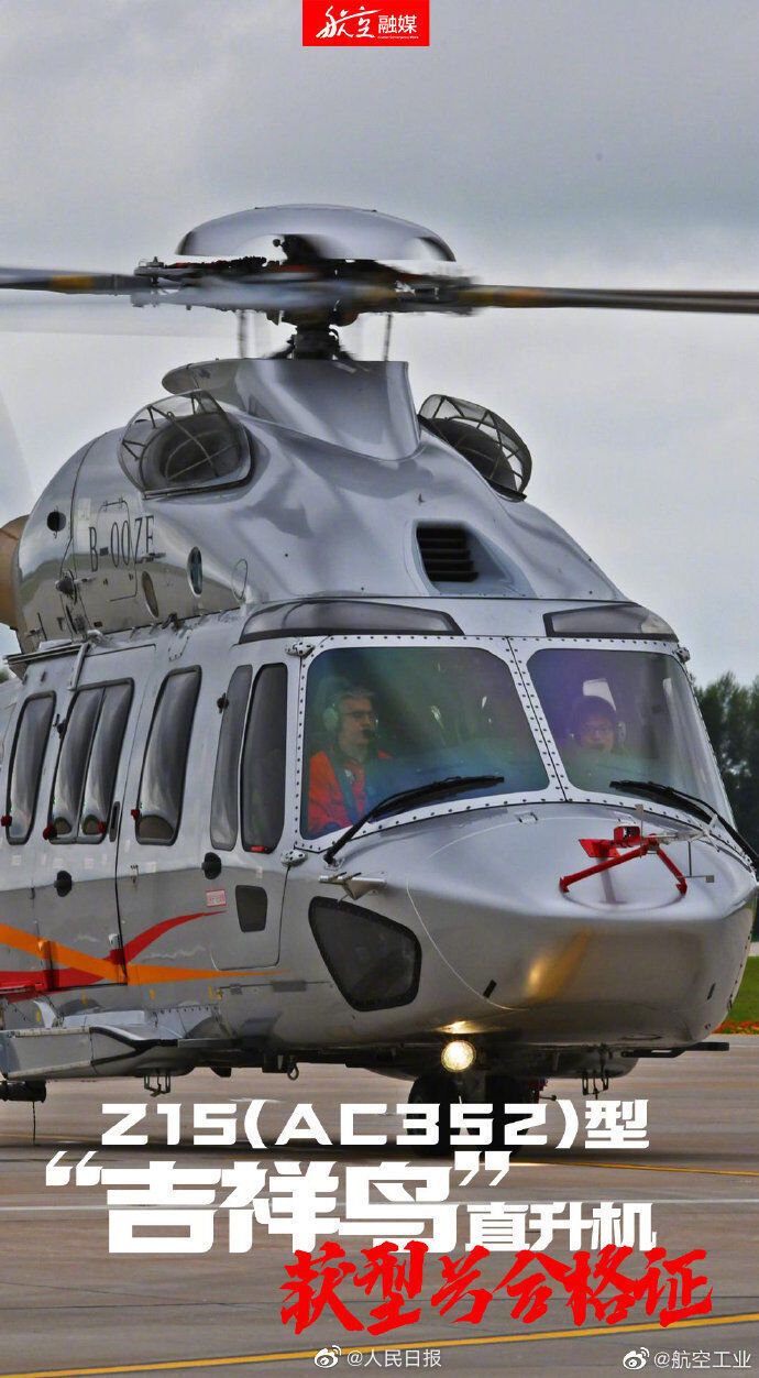 吉祥鸟直升机来了!26日,中国民用航空局向航空工业哈飞颁发了AC352直升机型号合格证,标志着该型直升机研制工作取得圆满成功,具备了进入国内民用市场的条件。AC352直升机是一款国产中型多用途民用直升机,最大起飞重量7.5吨,最大航程850公里,可搭载16名乘客,可广泛应用于搜索救援、人员运输、医疗救护等领域。