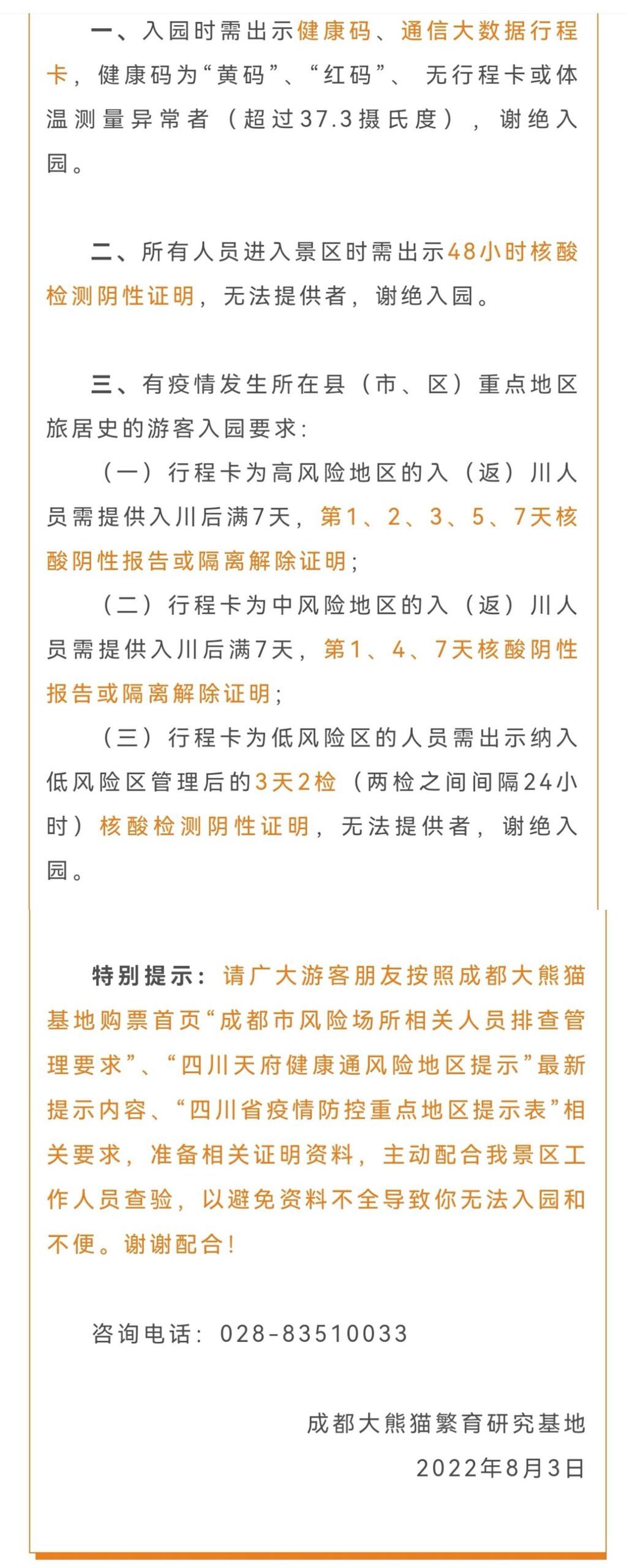 记者从成都大熊猫繁育研究基地获悉,根据《成都市成华区新冠肺炎疫情防控指挥部关于分级分类调整疫情防控措施的通告》(2022年第18号)精神,成都大熊猫繁育研究基地从2022年8月4日起恢复对外开放(除博物馆、探秘馆等室内场馆暂时关闭外,其他区域正常参观),餐饮场所恢复营业,按照不超过餐位数50%控制就餐人数,保持餐位距离。园区内已经做过全面清洁消毒消杀工作。